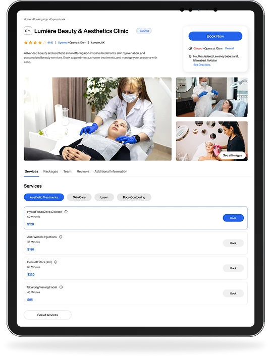 ExpressBook is a powerful booking software for beauty salons and aesthetic clinics. Automate appointments for injectables, facials, laser treatments, and cosmetic procedures while managing staff schedules and reducing no-shows, all in one secure platform.