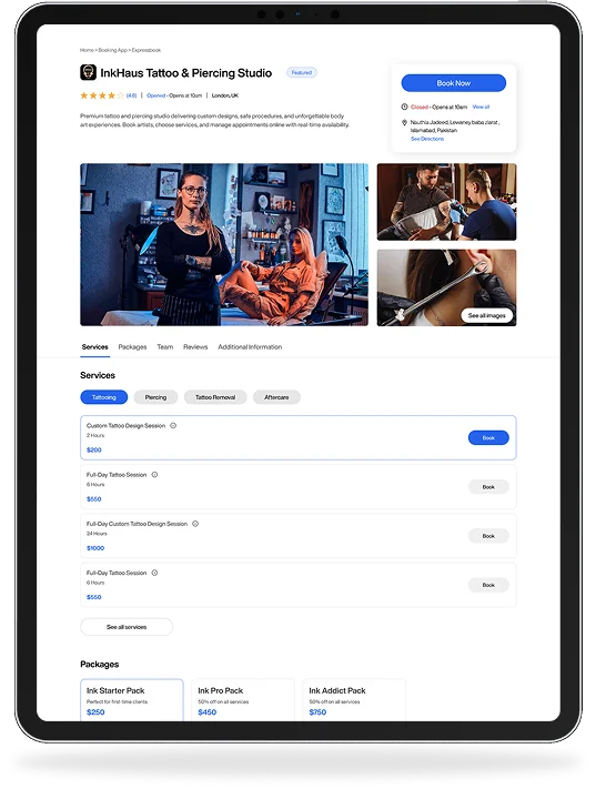 ExpressBook is a powerful online booking software for tattoo and piercing studios. Manage consultations, custom sessions, walk-ins, artist schedules, and automated reminders, all in one easy-to-use system designed to reduce no-shows and maximise studio bookings.